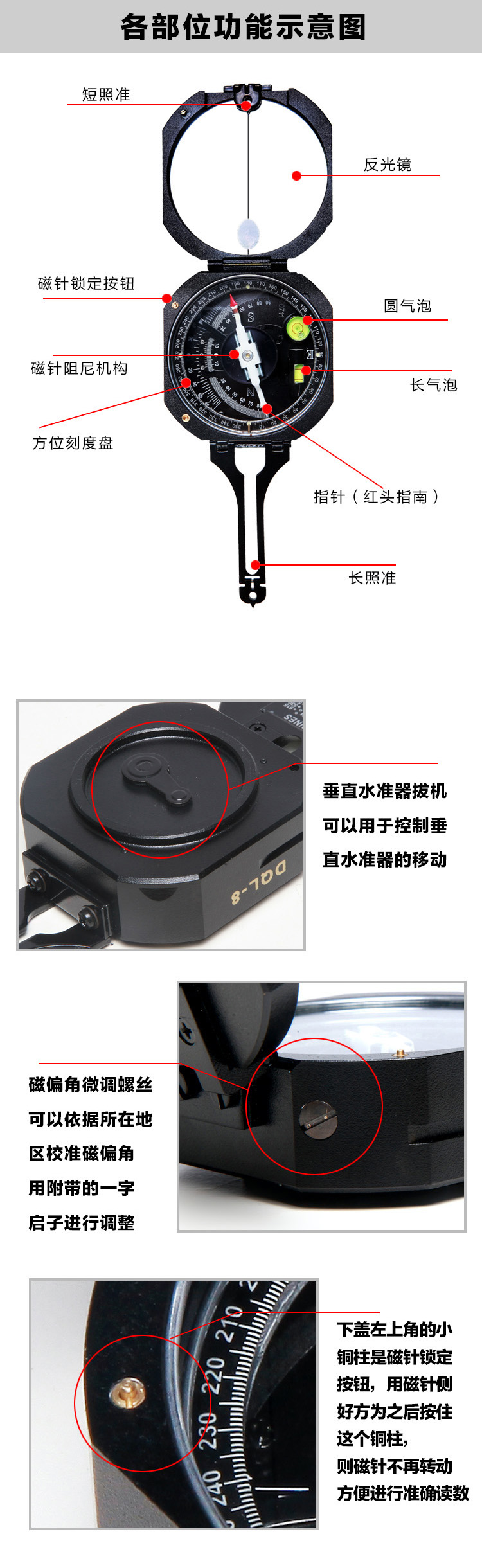 a.磁针转动前后所指示之度数误差不大于0.5°。b.磁针在0-180°、90-270°处由于偏心所引起误差不大于0.5°。c.测角器的读数误差不大于0.5°。